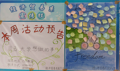 为了让更多的同学清楚的知道自己在大学生活中最想干的事,从而实现更好的自己。2016年4月11日中午,经济贸易系团总支、学生会积极组织同学们开展了“大学,想做的事”’活动。