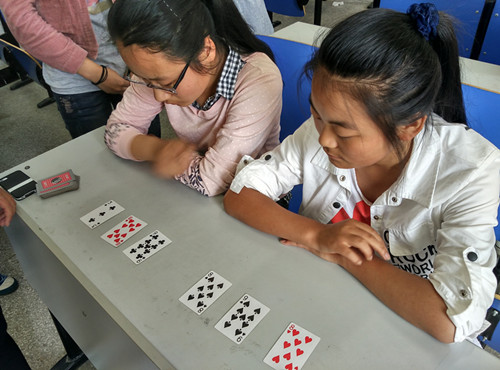 活动过程中,同学们分别记住不用花色不同张数的扑克牌,时间为5秒,同学们用最快的速度记住了那些扑克牌上的花色,然后现场回答。最终,15级工商企业管理班韩彩虹获得第一名,15级会计4班卢雯雯获得第二名,15级商务英语班董子瑜获得第三名。