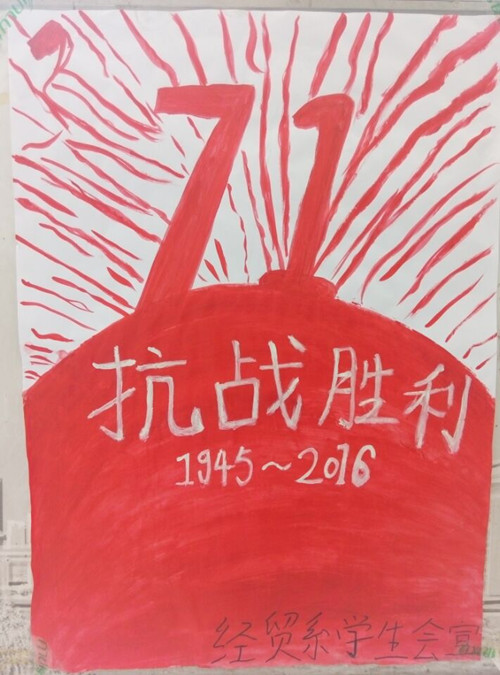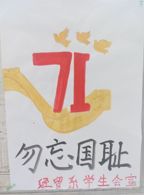 为大力弘扬爱国主义精神和抗战精神,培育和践行社会主义核心价值观,激发民族自信心和自豪感。2016年9月3日,经济贸易系团总支、学生会组织同学们画纪念抗战胜利71周年宣传海报。