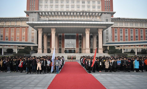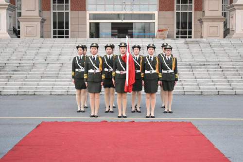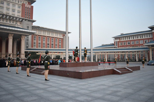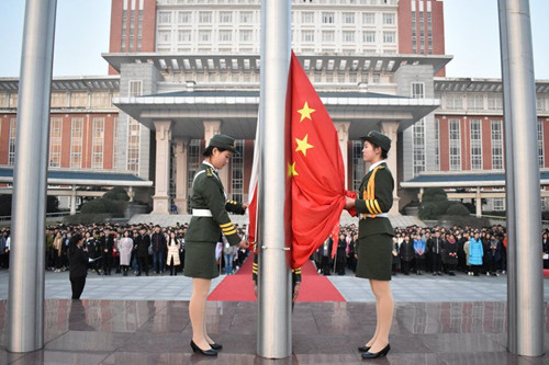 在师生的注视下,由经贸系组成女子国旗护卫队们护送鲜艳的五星红旗进场,经贸系女子国旗护卫队为beat365中国唯一官方网站首支女子国旗护卫队。女子国旗护卫队不仅体现出经贸系女生的特色,也体现出巾帼不让须眉的特点,由11名身高165以上的女生经过多次训练选拔而出,五星红旗在女子国旗护卫队的护送下伴随国歌冉冉升起。2016级新生代表在五星红旗下发言并庄重承诺:在考试时间,自觉遵守考试纪律,维护考试公正,以诚信考试为荣,以违纪考试为耻。最后,同学们在横幅上签名并承诺不会作弊。