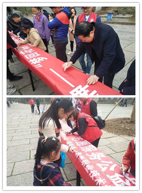 志愿服务不仅仅体现在为做好事,对于传统文化的弘扬,提升精神追求更是志愿服务的另一种表现形式。此次“梦回花朝”志愿服务公益活动分为两个部分。第一部分为传统文化展示和解说。有古典剪纸、《醉翁亭》诗歌朗诵、古筝演奏《渔舟唱晚》、书法展示等节目,这些节目让游客们赞叹不已,阵阵喝彩。随后舞蹈《惊鸿舞》将人们带入美轮美奂的场景中,翩若惊鸿婉若游龙,给人们留下无限韵味,随后,琅琊华梦汉服社的同学们为游客们展示了道袍、齐胸襦裙、曲裾、朱子深衣等传统汉服,通过对每款汉服的解说,使过往游客对传统汉服有了一个全面的了解。弘扬传统文化,践行雷锋精神,做文明旅游人,展示结束后,游客们纷纷在此横幅上签字。