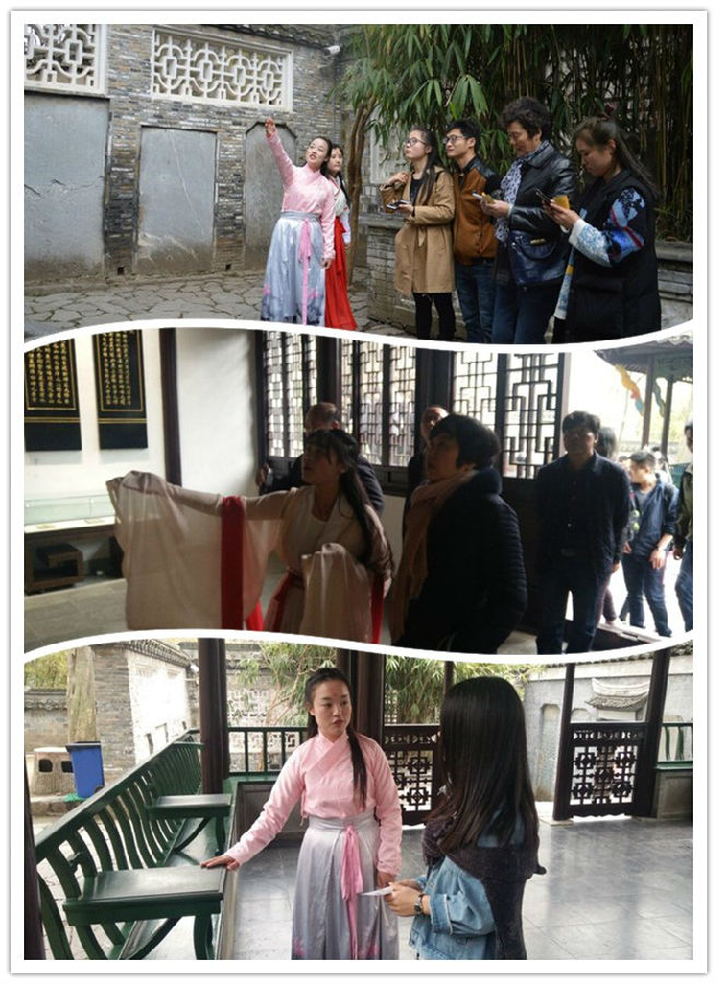 活动第二部分是由我系旅游管理专业的志愿者们身着汉服在醉翁亭景区内免费为游客进行志愿服务导游讲解,身着汉服的志愿者们为游客一一讲解醉翁亭内的古迹以及历史典故,赢得了游客们的一致赞扬。