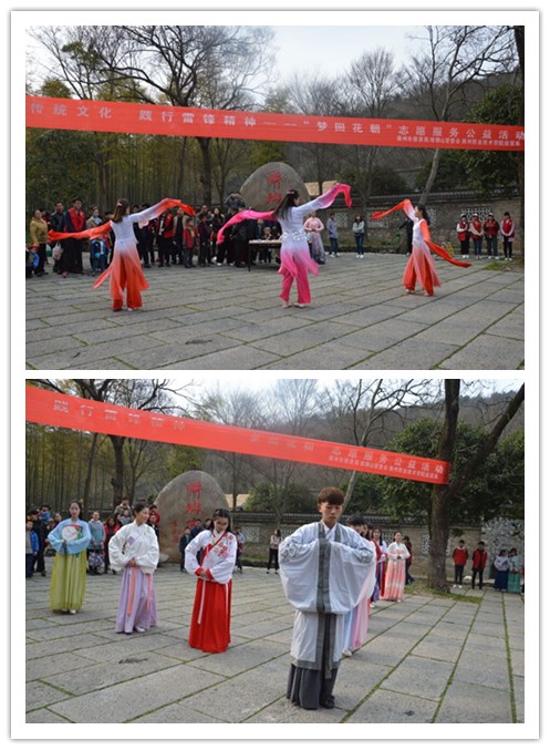 弘扬传统文化,践行雷锋精神,3月18日,经贸系携手滁州市旅游局、琅琊山管委会、琅琊华梦汉服社于琅琊山景区开展弘扬传统文化,践行雷锋精神,“梦回花朝”志愿服务公益活动。经贸系团总支书记何文婧老师、经贸系陈晓鸣老师及滁州市旅游局的工作人员参加了此次活动。