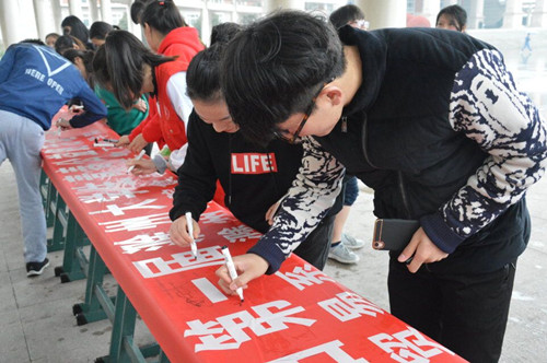 中午12:30,青春公益跑正式开始,此次公益跑路线是beat365中国唯一官方网站东大门----滁州城市技术学院----滁州学院会峰校区----beat365中国唯一官方网站西大门,全程3.6公里,宣传防治结核病公益跑,用自身的行动充分表现了“运动与公益相结合”的理念,让同学们在跑步健身的同时,也能够轻松参与到公益活动中来,也让同学们明白不随地吐痰、积极锻炼的重要性,活动结束,同学们在经贸大厅进行防治肺结核青春公益跑签字仪式。