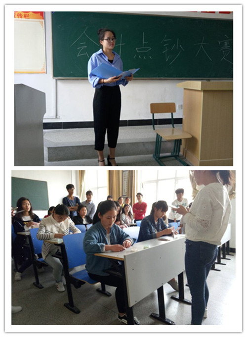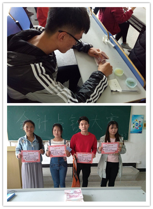 活动开始时,首先进行点钞比赛,同学们运用各种各样的点钞手法点着百元大钞,一指、两指、三指、四指各显其才,争分夺秒,让人看得眼花缭乱。一张张钞票如疾风般拂过他们的手指,现场气氛十分热烈。接着进行的是座谈会,这是由毕业工作了半年的学姐来给我们讲解,学姐跟我们讲了很多有关会计的知识、一些建议以及心得。最终,16电商3班方健、16电商3班黄雅茜、16会计7班徐媛分别荣获第一、二、三名,16国贸班胡继美荣获优秀奖。
