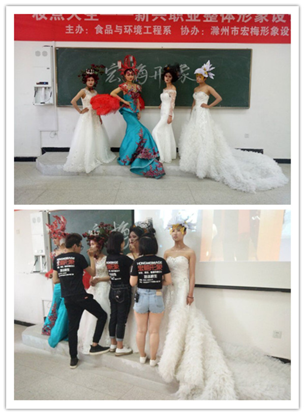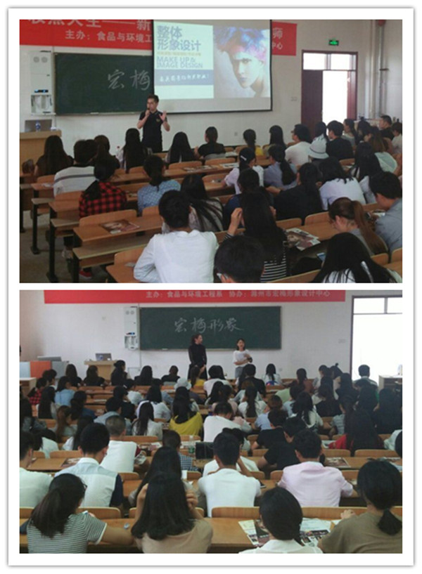 讲座一开始,著名造型设计师首先简单介绍了基础美妆知识,让学生们对化妆有了初步的了解。讲座过程中,为了使较少接触化妆的女大学生对化妆有更加直观的了解,还当场请出模特,介绍其妆容及寓意。
