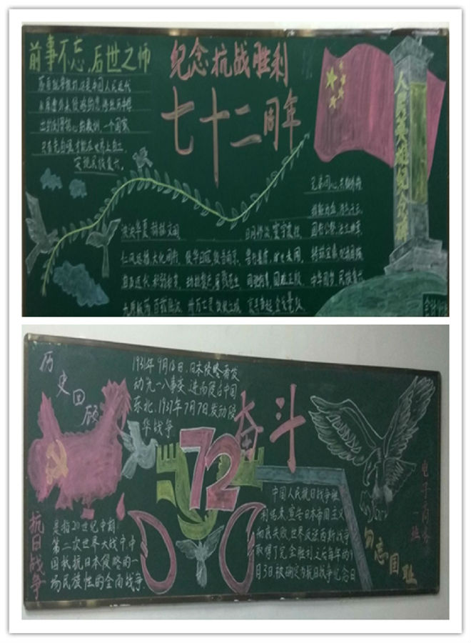 为响应中国人民抗日战争胜利七十二周年纪念,2017年9月18日,经贸系开展了纪念抗战胜利黑板报评选活动。