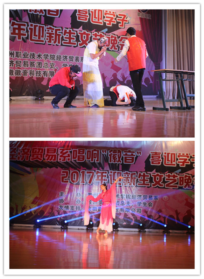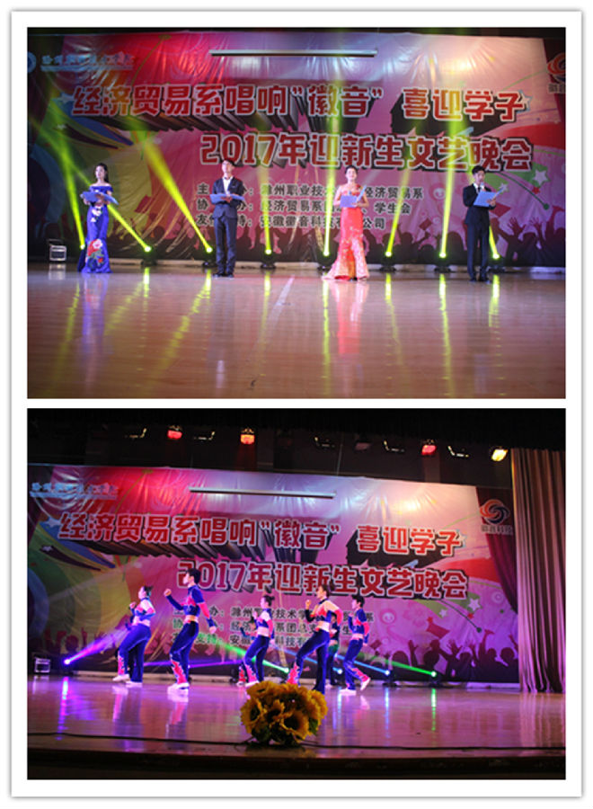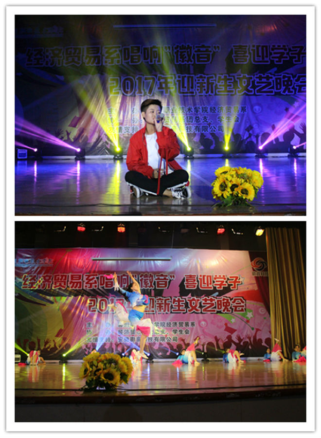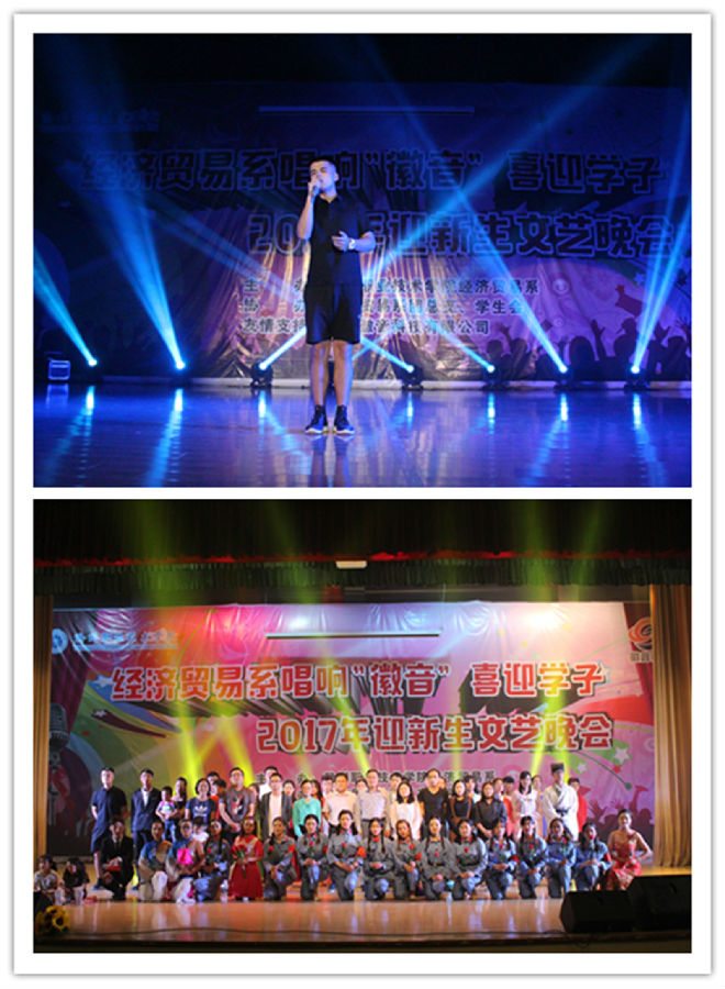 为了迎接2017级新生的到来,展现经贸学子风采,9月26日晚,经贸系唱响“徽音”喜迎学子2017年迎新文艺晚会在学院大礼堂举行,经贸系党总支书记李有志、副主任宋君远、院团委副书记程诚、院实训中心副主任刘杰、安徽徽音科技有限公司副总经理陈晶晶等出席晚会,经贸系部分老师、2017级全体辅导员及新生共同观看了演出。