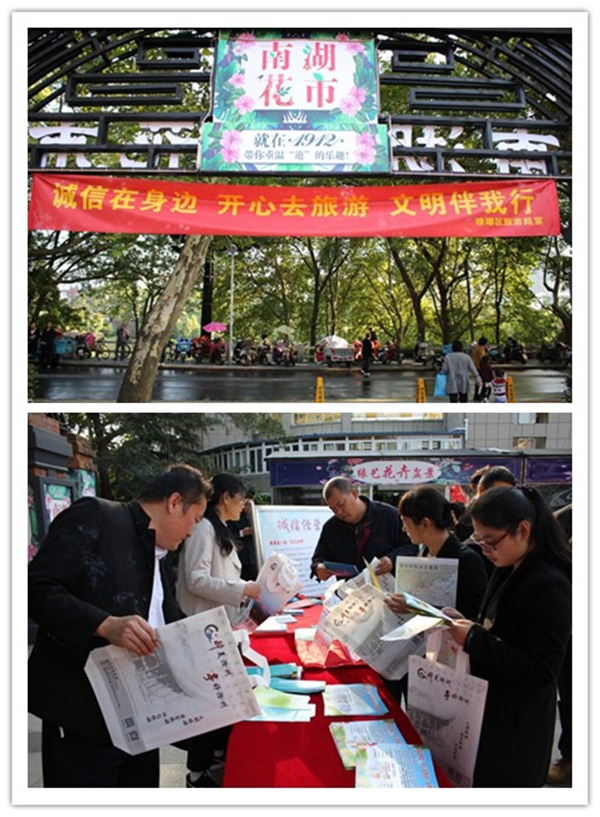 活动一开始,经贸系干事们先向周围群众发放有关安全旅游,文明出行的传单以及滁州市的交通地图、安全知识等一些有关资料。活动过程中,经贸系干事们向周围群众讲解一些出行时所要注意的安全细节。随后经贸系干事们引导群众参与到活动中来,签名留照。活动最后,经贸系干事们与旅游局相关工作人员合影留念。