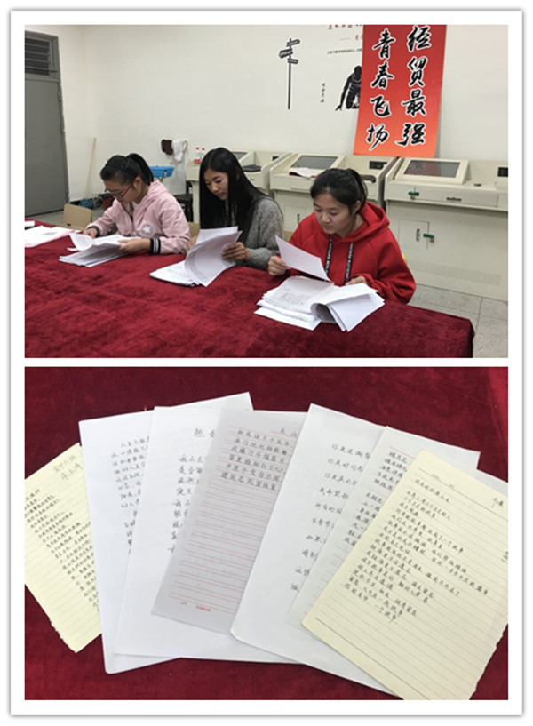 本次活动以投稿方式进行,用信纸或A4纸写一段文字,字体和内容不限,要求卷面整洁,无涂改痕迹。本次活动由学生会办公室副主任王惠、女生部部长曹嫚嫚与学习部副部长卓海凤三位评委持着公平公正的态度对参赛作品进行打分。最终,17级空乘班付传志获得一等奖;17级会计六班朱玉情、17级商务英语班吴悦美获得二等奖;17级城轨二班齐澳、17级旅游管理一班周于情、17级会计六班张怡宁获得三等奖;17级市场营销二班崔北芬、张潇潇、17级商务英语班邹婷婷获得优秀奖。