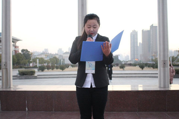 本次升旗仪式分为两项议程。第一项议程,升国旗奏国歌。伴着雄壮的国歌声响起,经贸系女子国旗护卫队的成员,迈着整齐的步伐,向国旗护卫台走去,接着五星红旗徐徐上升。全体同学注目行礼,即使是寒风也挡不住同学们的热情。第二项议程,由经济贸易系工商企业管理刘俊杰做国旗下代表发言,提前预祝同学们新年快乐。