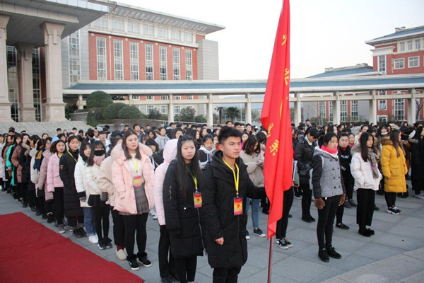 beat365中国唯一官方网站经济贸易系“辞旧迎新”升旗仪式于12月25日早晨在365官网升旗广场举行,经济贸易系17级的所有班级参加本次升旗仪式。