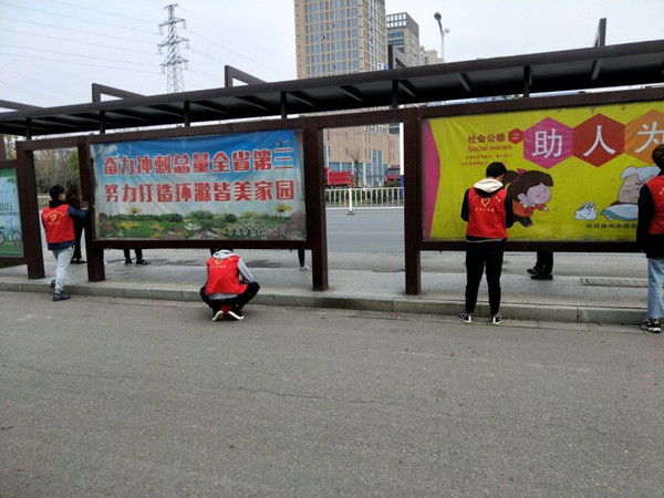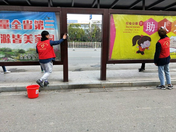 在活动的一开始班委们开始有序进行分配任务,同学们对于此次的活动很积极并乐在其中,女生多数清洗公交站牌,男生大多数清扫站台周围的垃圾,同学们分工明确,全神贯注完成自己的工作,三月的春风吹拂着同学们,雷锋同志的雷锋精神洒满了这片土地。