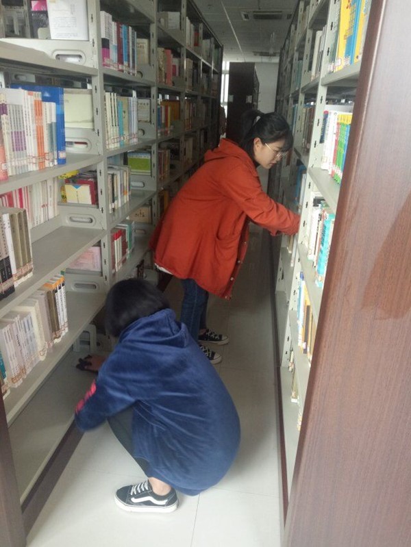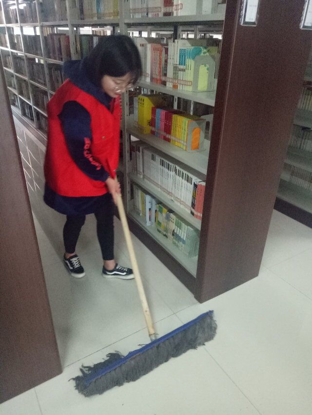 志愿者自带抹布、盆、扫帚、簸箕、拖把等工具按时来到图书馆一、二、三层楼进行卫生打扫。活动一开始,志愿者们分工明确,书橱的各个角落无一遗漏,地面被打扫的一尘不染。在服务活动过程中,志愿者们始终保持安静,自觉维护图书馆良好读书氛围,有条不紊地整理书籍,并把书本按类别归类。