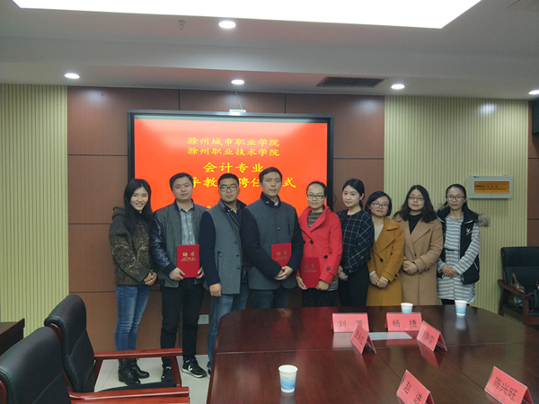 2018年3月14日下午,经贸系党总支书记李有志、组织人事处处长李超、经贸系副主任宋君远及会计教研室5名专职教师赴滁州城市职业学院参加该院会计专业青年指导教师受聘仪式。该活动是我院为进一步增强校际合作,充分发挥两校专业优势、取长补短,形成合力并进、互相帮扶的专业发展模式而做出的一次尝试。