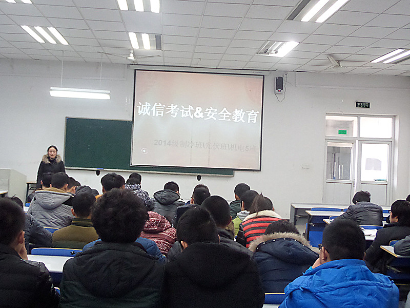 在期末考试来临之际,为响应学院关于加强考风考纪,教育同学们做诚信大学生,以及加强对大学生安全防范教育,机电系各班级于近期召开了“诚信考试,安全教育”主题班会。