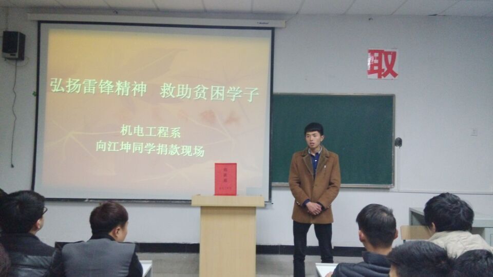 他叫江坤,是我们学校信息系的一名学生,在去年他被确诊为患有尿毒症,并且病情正在迅速加急。他的家庭环境不是很好,父亲早逝,母亲一个人将他们兄弟三个拉扯大。机电系师生得到这个消息后,在机电系团总支的组织和号召下,机电系全体师生发起了为身患重病的江坤同学献爱心捐款的活动。大家纷纷伸出了援助之手,慷慨解囊,奉献出了自己的一份爱心。你五十他一百,带着机电系师生满满的爱心与祝福纷纷投进了募捐箱,短短几天时间,机电系在校大一大二学生884人和教师共筹得善款7104.7元。机电系师生用实际行动传承雷锋精神,践行社会主义核心价值观。