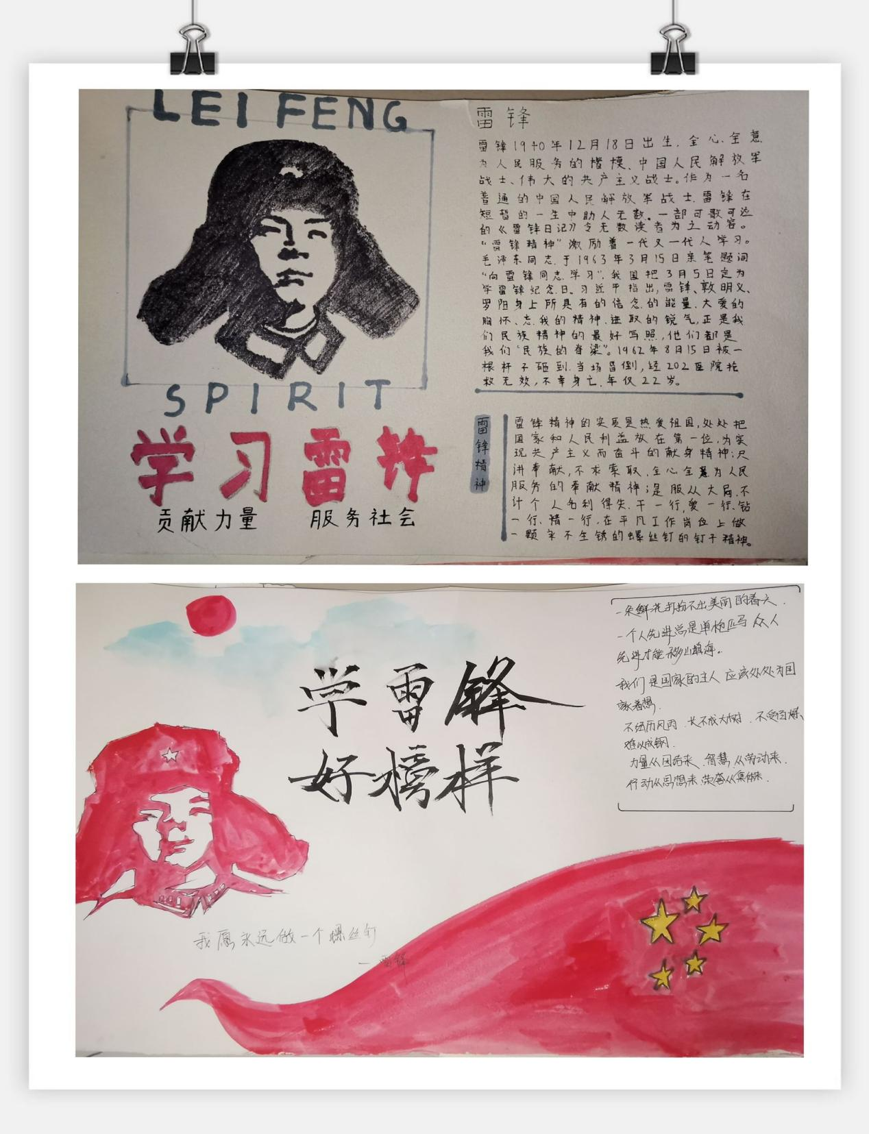 活动期间各班积极参与,以丰富多彩、图文并茂的形式在黑板报、手抄报上展示了学雷锋、讲文明等宣传内容。手抄报描述了雷锋同志的光辉事迹,赞扬了他的“钉子”精神,歌颂了他全心全意为人民服务的品质。各班设计的板报新颖独特,既弘扬了雷锋精神,又赋予其时代精神。