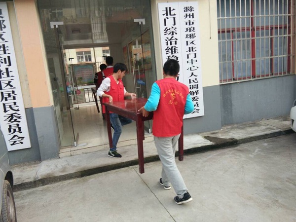 下午2点,志愿者抵达北湖小区星星家园,红色的马甲为这个“简单的家园”增加了一道美丽的风景线。在老师的指挥下,志愿者们各自分配工作后,开始紧张的忙碌起来;志愿者们发挥着“不怕苦、不怕累、不怕脏”的奉献精神,搬各种器材、桌椅和一些教学器械。即便这些东西上布满灰尘,志愿者们依旧干劲十足。