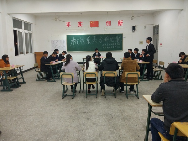 为了进一步加强同学们的交流与合作,提高大学生的辩论能力与合作能力,增强大学生与人沟通的语言组织能力,机电系在举办辩论赛初赛之后,又于2016年12月8日晚上7:00在5203,5303,5403教室举行了复赛。