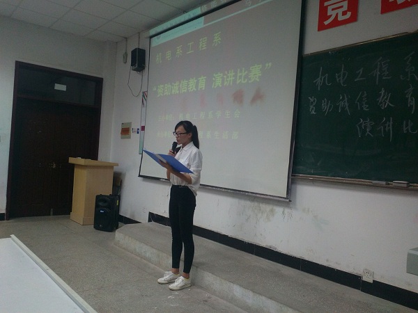 为进一步引导大学生树立诚信意识,规范诚信行为,提高文明素养,营造积极、奋进、诚实守信的校园文明氛围,培养大学生诚实手守信的优良品德,促进大学生全面发展,机电系学生会于2016年5月26日晚7:00在5103教室开展“资助诚信教育”演讲比赛。