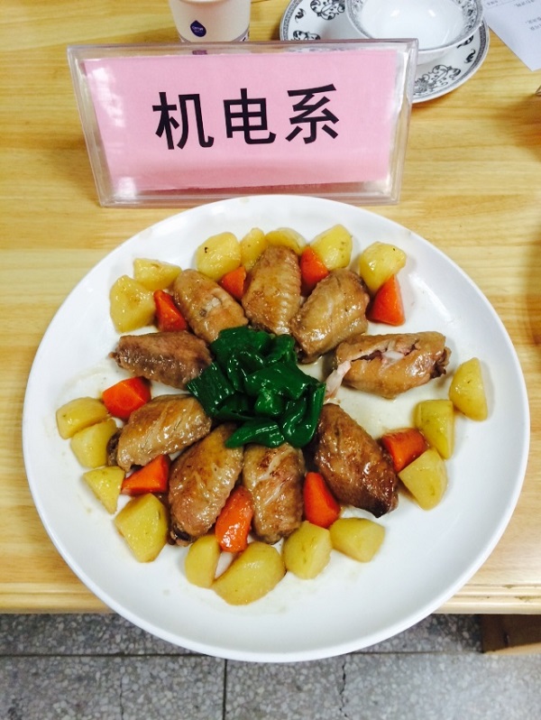 机电系代表队在赵新华老师的带领下,展现了我系师生非凡的厨艺。最终经过烹、煮、煎、炸,我系以一道《展翅腾飞》取得第三名的好成绩。我们不仅菜做的好吃,而且意义非凡。一道黄焖鸡翅,寓意我院通过迎评促建工作,展翅腾飞。而盘中的九块鸡翅也暗示着我院办学有方,长长久久之意。