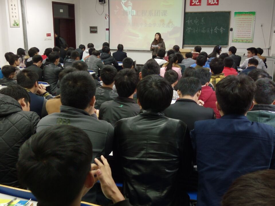 2015年11月23日,机电系团总支在5103教室召开十八届五中全会精神专题学习交流会。此次会议由团总支副书记张宏影主持,机电系团总支、学生会、社团、各班团支部学生干部参加本次会议。