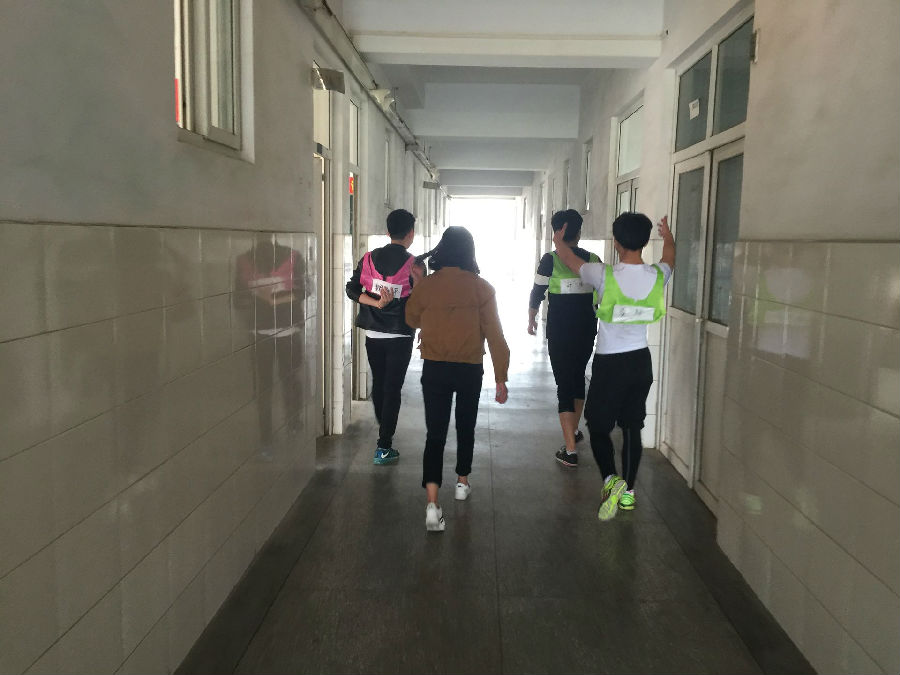 此次游戏分为两部分,第一部分是同学们通过小游戏的优胜赢得积分,获得优先进场权;第二部份是各组在特定的区域内寻找7张卡片,这期间,每组队员要相互协作,保护好自己的名牌,被撕即淘汰,找齐7张卡片的队伍获胜。 2:30同学们齐聚技师学院操场,根据提前选好的分组,各自组成1, 2, 3, 4, 5组,并贴上写有自己名字的名牌.五个小组先后进行了“绑腿跑”、“引导走迷宫”的较量,最后3组获得优先进场权。
