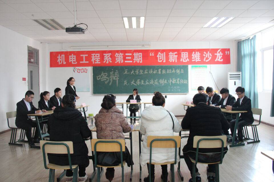 2015年12月31日,由机电工程系、地方高职院校创新创业教育名师工作室、科技创新与发明协会联合举办的机电工程系第三期创新思维沙龙暨机电系“鸣·辩”杯大专辩论赛总决赛在5403举行。机电系党总支书记晋太洋出席了此次沙龙活动,机电系团总支负责人谢丽丽、团总支副书记张宏影、学生会主席王梦瑶、科技创新发明协会会长化朝阳担任本次活动评委。
