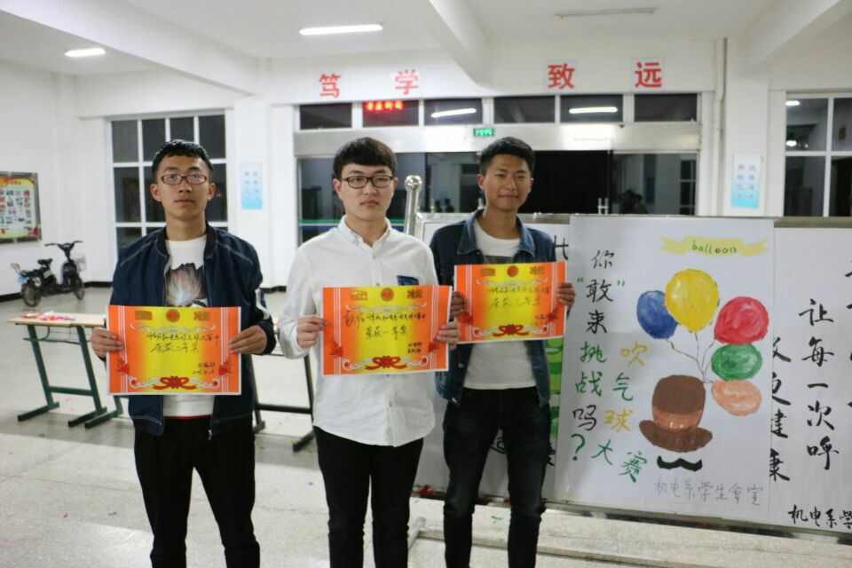为了丰富课余生活,也同时让同学们增进友谊。2016421日晚上,机电系“爆炸吧,气球”比赛在五号楼大厅举行,此次活动由我系学生会纪检部组织。