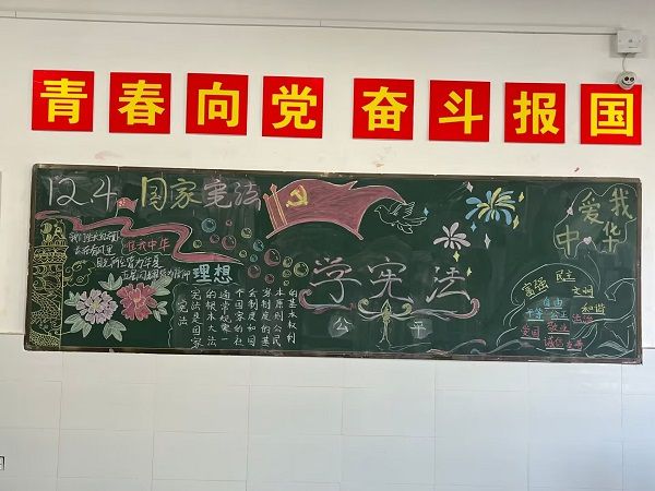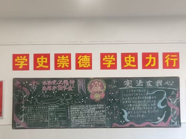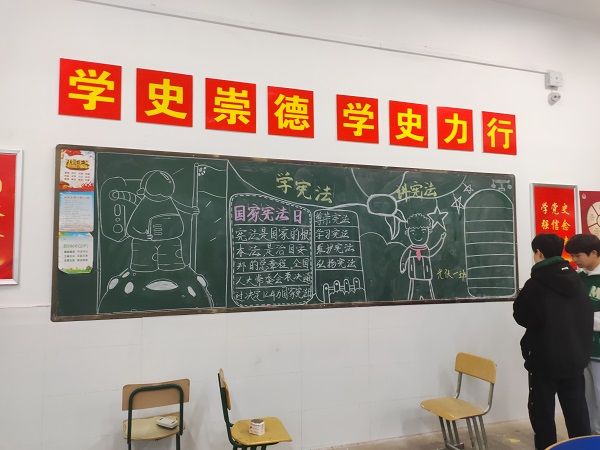 活动中,在各班级主要班干部的带领下,学生们积极踊跃的参加“宪法宣传周”之黑板报设计活动,搜集与宪法相关的信息材料,并结合自身实际和现实情境,讲认识、谈体会,将自己对宪法的理解和情感融入黑板报的设计之中。同学们纷纷表示,“我们生长红旗下,长在春风里,目光所及皆为华夏,五星闪耀皆为信仰。要坚持从自己做起,从身边小事做起,自觉做到学法、知法、守法、用法,做推广宪法,遵守宪法的主人的观点”。