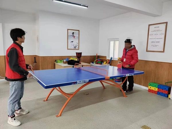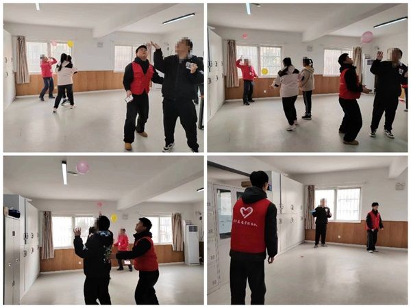 我院青年志愿者身着红色马甲,带着温暖与关爱踏入了这片特殊儿童的世界。今天义务支教的内容主要是多种运动锻炼小游戏的练习,首先,是乒乓球的对打练习。志愿者通过简单初级的发球方式,与星星孩子进行了乒乓球互动练习,充分锻炼了星星孩子的注意功能和执行功能。随后,我院志愿者自发设计了两种互动游戏,分别是“顶气球”、“跟着指令做动作”。星星孩子们在游戏中充分的发挥着主观能动性,与志愿者们积极互动交流,整个过程充满了欢声笑语,乐此不疲。
