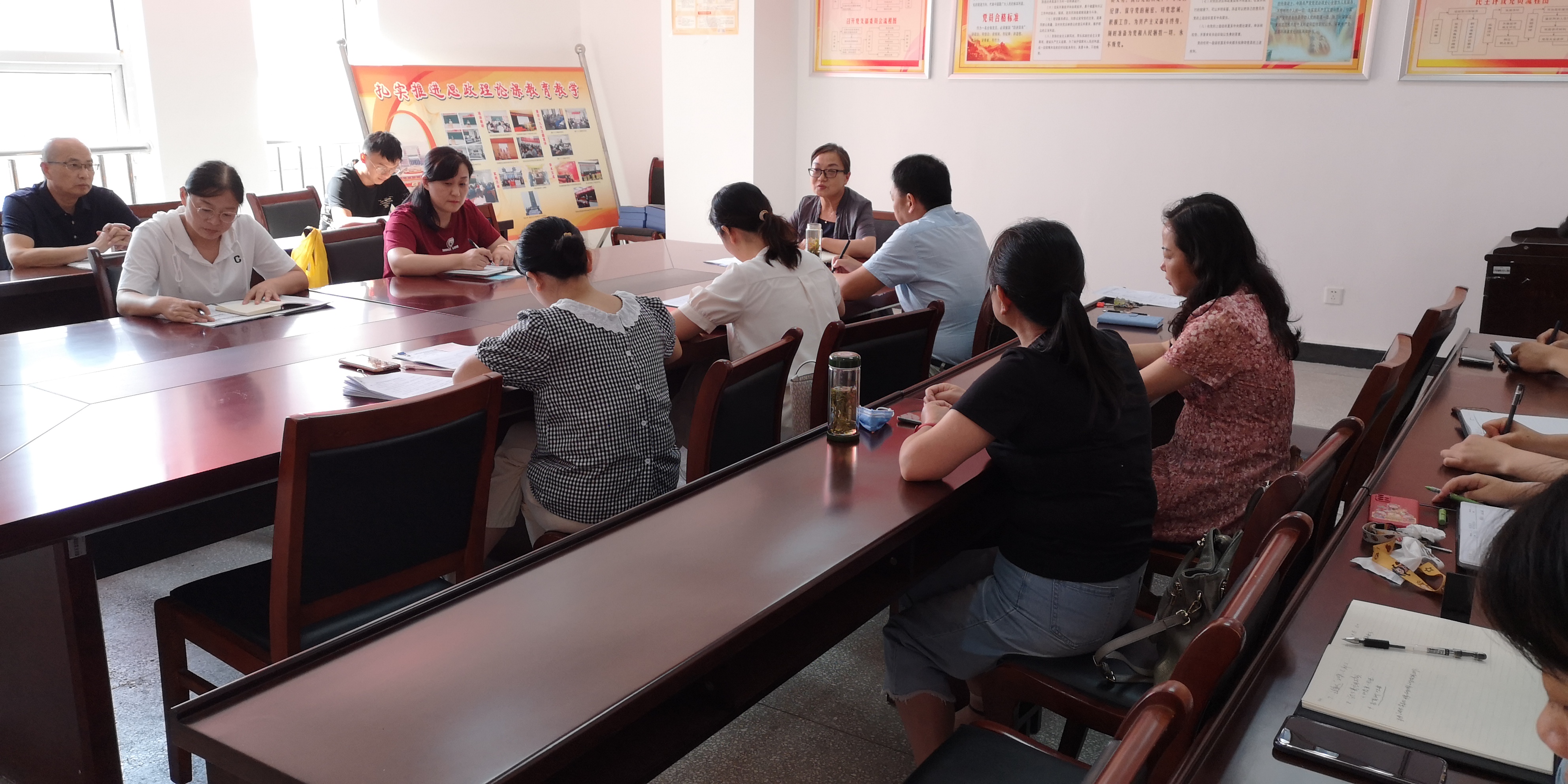 在部门工作会议部分,首先李爱红对部门暑假开展的教科研、思政阵地建设、文明校园创建、“四个年”和“两个创建”等工作进行了通报,重点对教学能力大赛取得的成果予以充分肯定,并对暑期科研方面工作进行分析指导;其次,教研室主任张家莉等教师做了教学能力大赛的经验分享,教学秘书付金凤老师通报了暑假全体教师培训情况,覆盖率达到420%,超额完成学校培训任务,组织委员陈琴汇报了文明城市创建志愿者服务安排和暑期工会工作。最后,马克思主义学院副院长孔金就新学期教学工作进行布置,并对新教师提出了相关要求,希望新教师在教学方面能够快速成长起来。