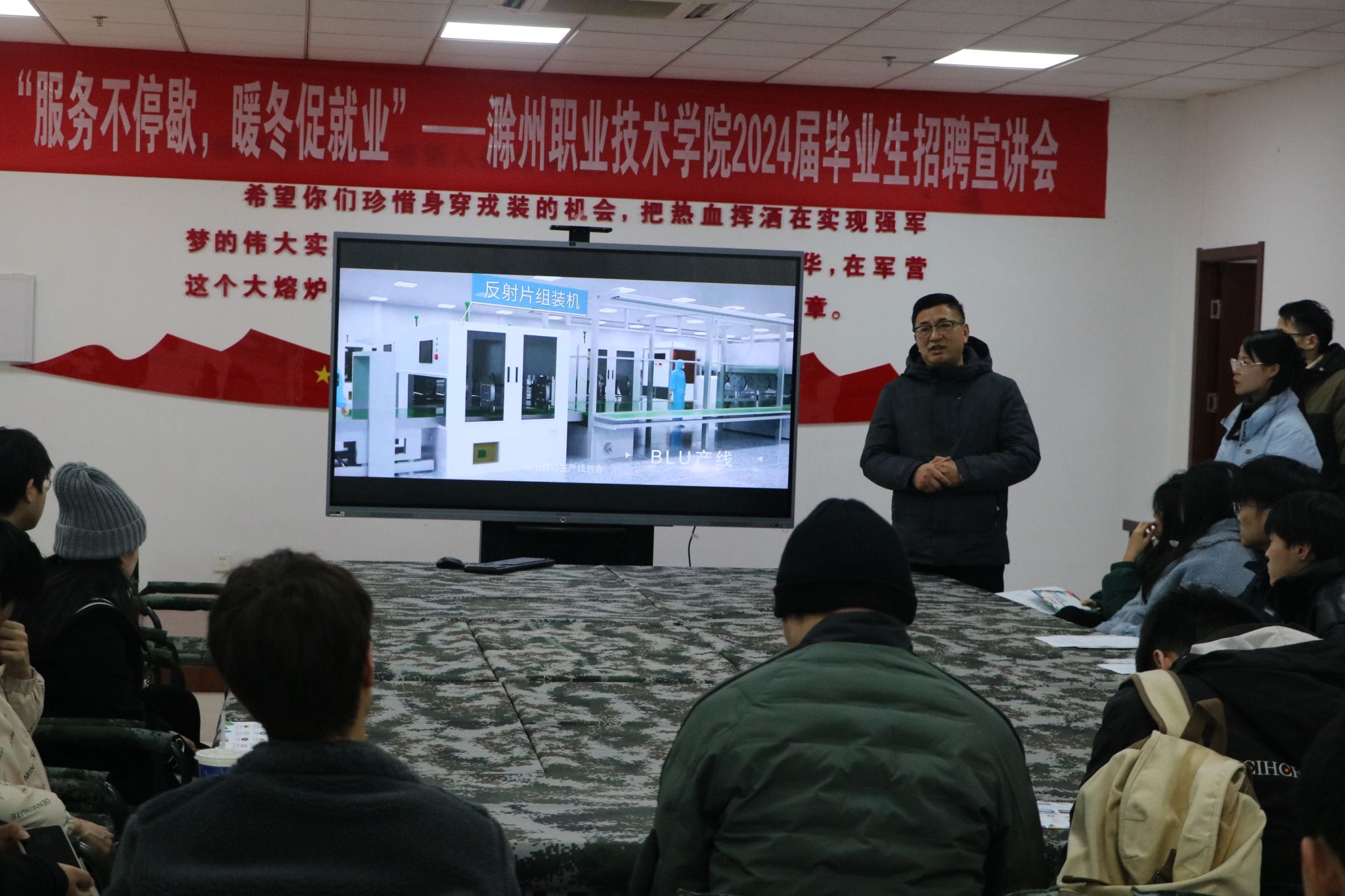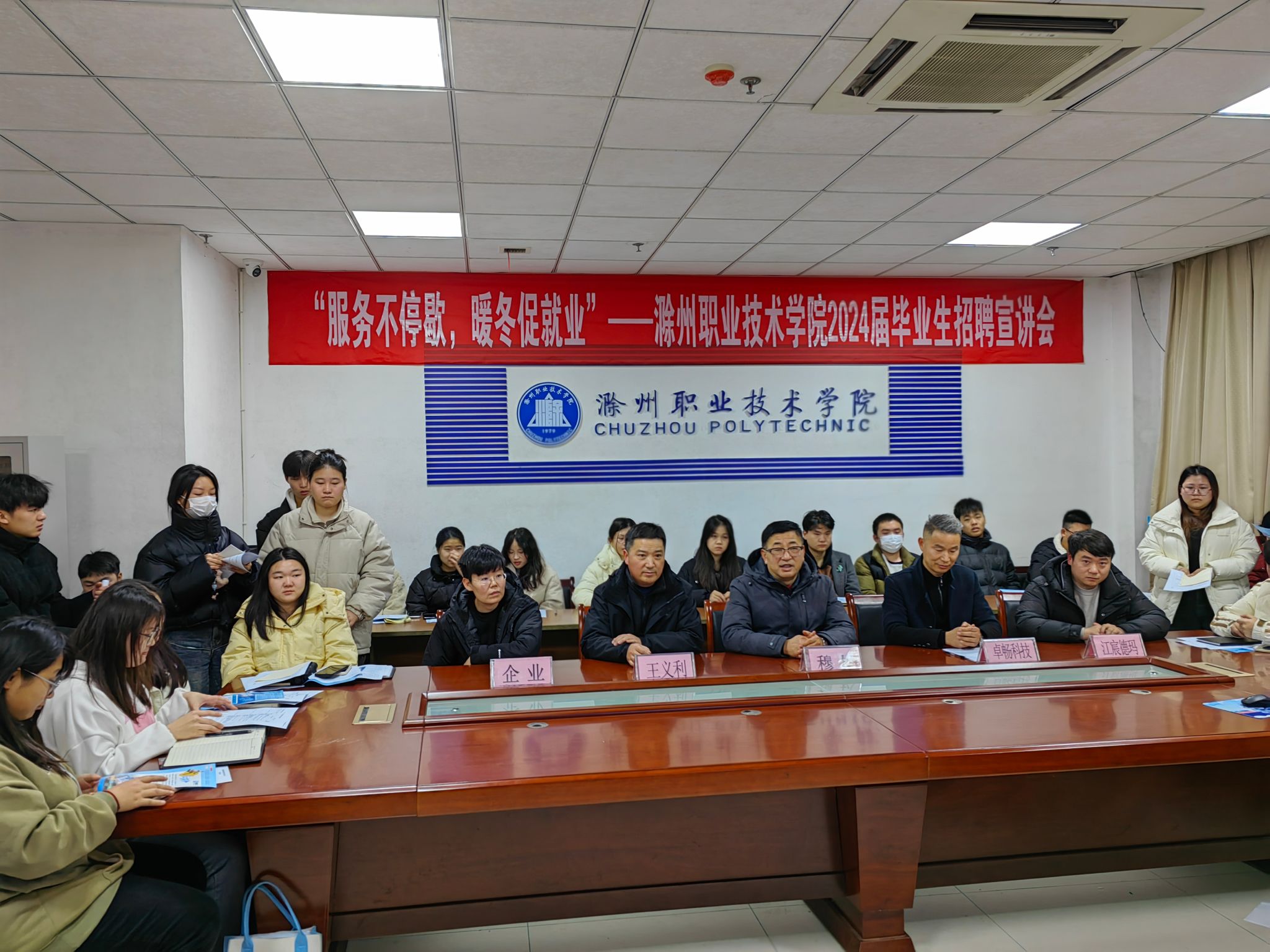 为确保毕业生在假期期间求职有渠道,就业有岗位。学校与12月26日和元月2日连续举办两场线上线下企业校园招聘宣讲会和就业岗位发布会,参与企业68家,提供就业岗位2216个。其中,滁州惠科光电科技有限公司、博晶科技(滁州)有限公司 、奶酪博士(安徽)食品科技有限公司、安徽卓畅新材料有限公司、德玛智能科技(滁州)有限公司和普瓦尼尼智能装备(滁州)有限公司等11家企业参加线下宣讲。企业代表们详细介绍了公司的文化、业务、未来发展方向以及学生关心的薪资待遇等问题,并在现场与学生进行了深入的交流和沟通,他们表示此次校园宣讲会是寻找优秀人才的好机会。在招聘环节中,同学们积极投递简历,展示自己的专业技能和综合素质,希望能够通过此次活动找到心仪的工作。此次系列宣讲招聘活动不仅为学生们提供了展示自己的平台,也为企业和学校提供了交流和合作的机会,对促进学生就业、推动365官网人才培养工作起到了积极的作用。