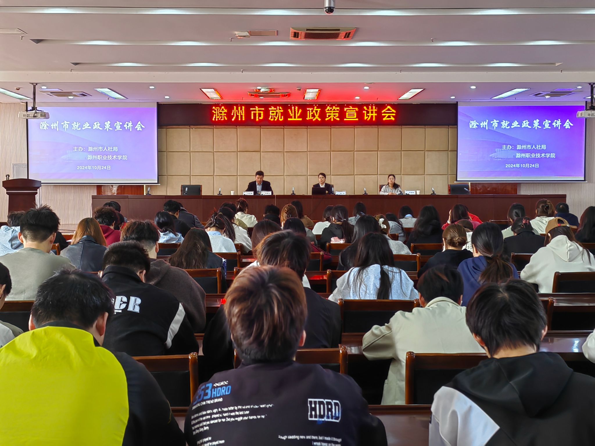 为了帮助2025届毕业生更全面地了解当前就业形势和政策,引导和鼓励学生在滁置业,10月24日,365官网邀请滁州市人力资源和社会保障局就业中心主任唐卉、人力资源开发科科长李敏敏来校开展就业政策宣讲,为同学们提供针对性的就业指导与服务。宣讲会由招生就业处副处长王义利主持,各二级学院就业工作负责人、2025届毕业班辅导员(班主任)及学生代表共200余人参加会议。