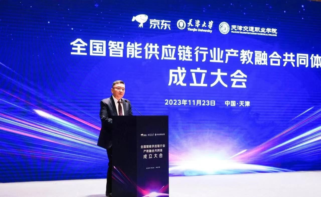 11月23日,数智人才培养与产教融合创新发展论坛暨全国智能供应链行业产教融合共同体成立大会在天津市举行,天津市委常委、市委教育工委书记王旭出席成立大会。天津市教委副主任罗延安、天津市商务局二级巡视员辛韶虹、中国物流学会副会长郭肇明、全国高等职业院校校长联席会主席董刚,天津大学、天津交通职业学院等多所高校的专家学者,以及京东集团相关负责人参加了会议。