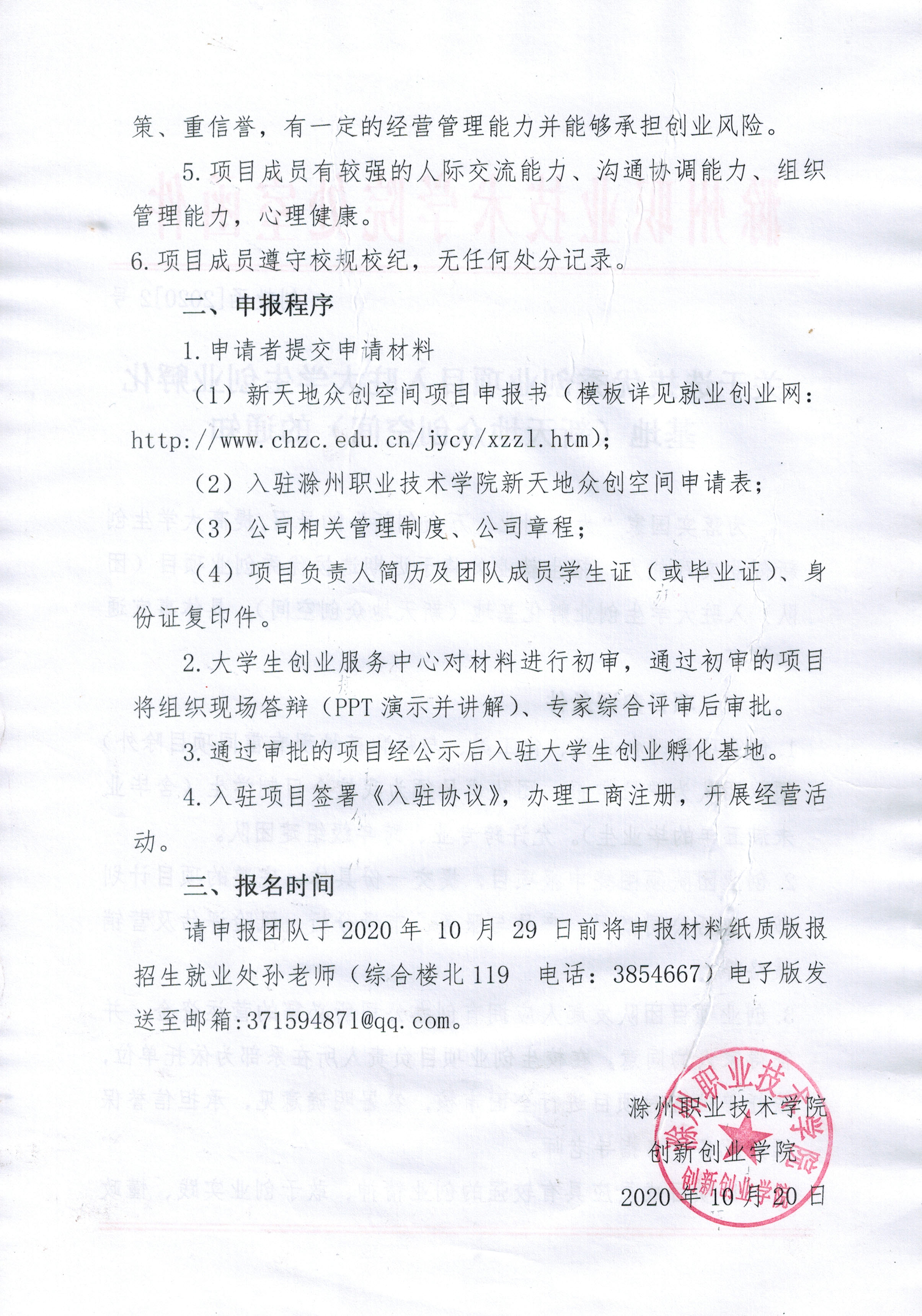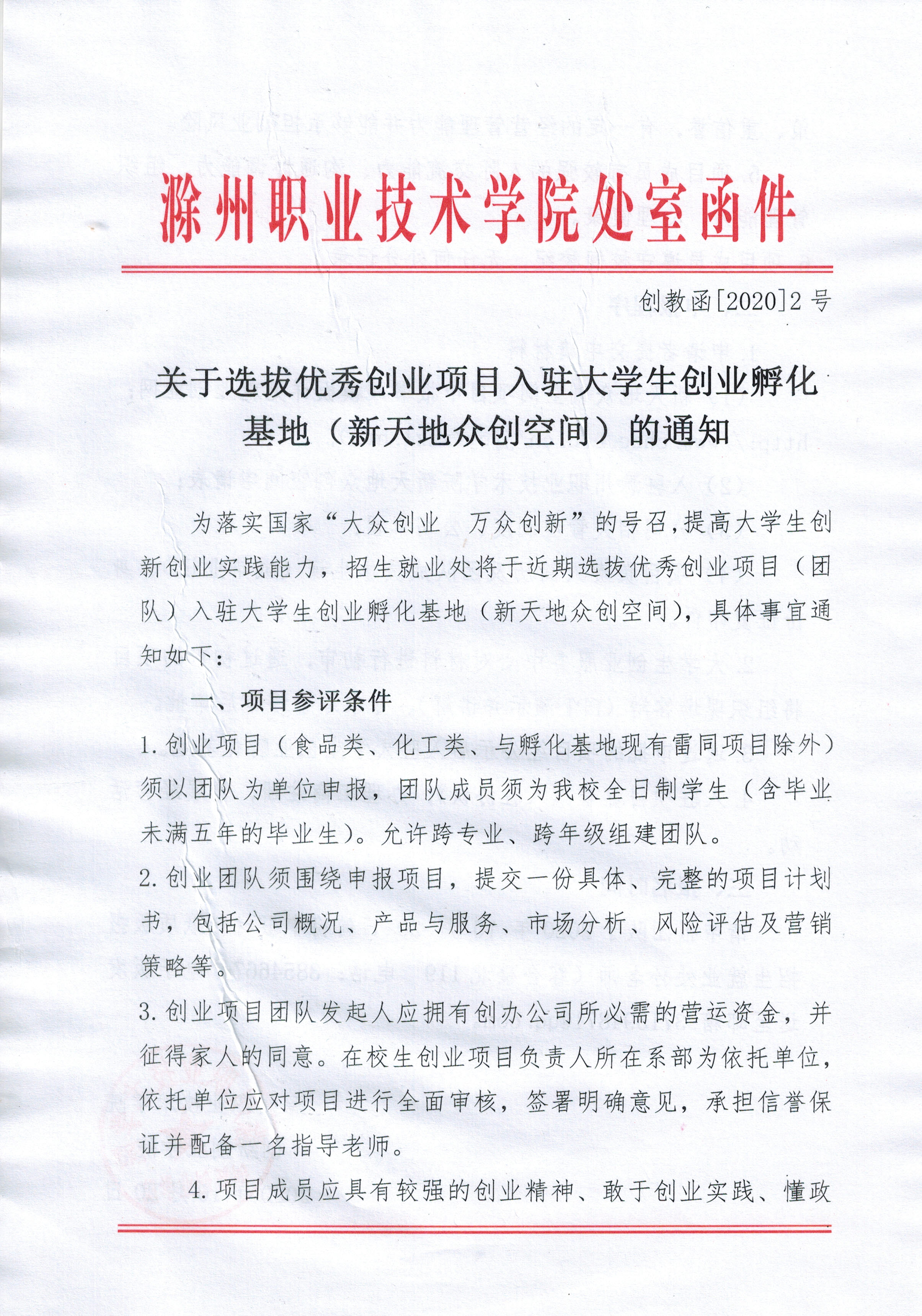 关于选拔优秀创业项目入驻大学生创业孵化基地(新天地众创空间)的通知