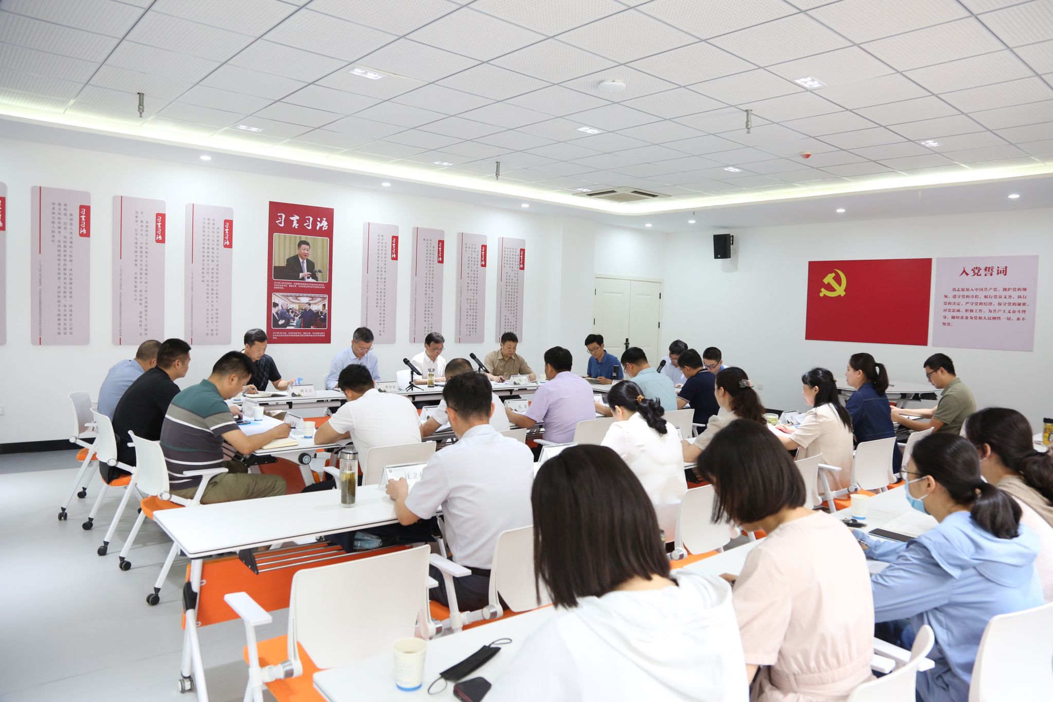 曹付忠实地考察了马克思主义学院办公场所和“大思政课”数字研学中心,并主持了调研座谈会。首先曹付忠开宗明义地指出,根据中共中央办公厅印发的《关于在全党大兴调查研究的工作方案》,在全党大兴调查研究,学校高度重视并贯彻落实,并结合习近平总书记在学校思政课教师座谈会重要讲话精神,各部门需共同研究做好全校的思想政治工作。调研座谈时,曹付忠全程认真听取了各部门的工作汇报和参会教师代表的交流发言。