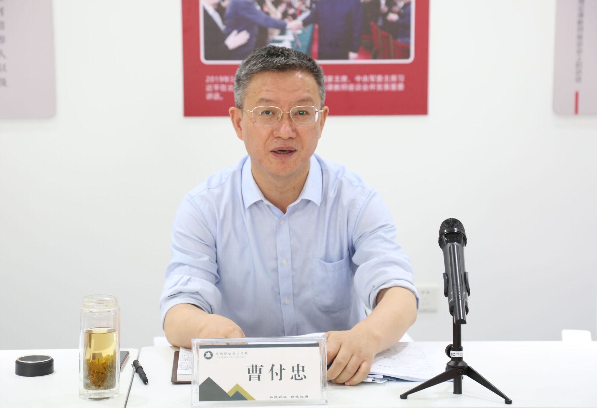 曹付忠在会上强调“立德树人”是新时代教育的根本任务,对于思政课教学:一是要提高对思政课育人重大意义的认识。增强思政课教师的荣誉感使命感责任感。二是要准确把握思政课的教学目标。以社会主义核心价值观为引领,提高政治理论素养,用党的创新理论武装头脑,弘扬以伟大建党精神为源头的中国共产党人精神谱系。要拓展视野,突出重点,抓好思政课教学工作和思政课教师队伍建设,如加强思政课教师政治建设、加强思政课教师政治理论学习、提升思政课教师教学能力。三是要推进“大思政课”建设。用好第二课堂、志愿服务、劳动教育等渠道,建好校外实践教学基地,善用社会大课堂,构建大师资体系,实现“大师进校园、名师进课堂”,一体贯通课程思政和思政教学。四是加强领导,形成更大合力。思想政治工作涉及学校发展的方方面面,宣传统战部、学生工作处、教务处、团委、组织人事处、总务处等职能处室做好本部门职责范围的思政育人功能,齐心协力形成合力,做好协同育人。未来寄希望于马克思主义学院把握好当前的发展机遇,拉升标杆,创新作为,提质增量,为落实立德树人根本任务持续发力。