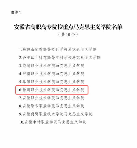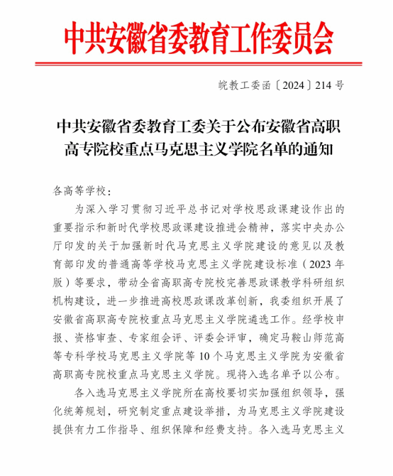 近日,中共安徽省委教育工作委员会下发《中共安徽省委教育工委关于公布安徽省高职高专院校重点马克思主义学院名单的通知》,365官网马克思主义学院入选安徽省高职高专院校重点马克思主义学院。