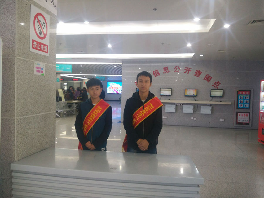 志愿者活动开始同学们都十分积极的主动报名。虽然大一新生部分学生是第一次当志愿者都有点生疏,但还是充满了热情。在政务中心,当他人需要寻找某个服务台时,志愿者都会热情的他们引路。遇到行动不便的人时,我们的志愿者都会主动上前搀扶。并且我们的志愿者服务态度很好,细心为他人服务,赢得了群众的夸奖。