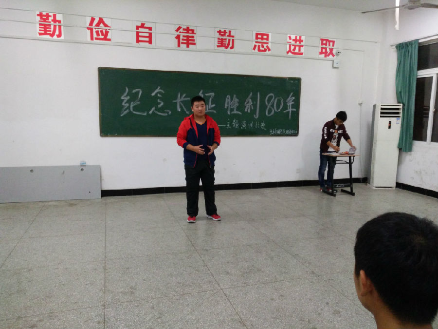 过程中,2位同学带来的表演《长征颂》,表达了新时期青年对于长征精神的感悟,对先辈的敬意为丰富新生的校园文化生活,弘扬伟大的长征精神,讴歌红军在中国共产党的领导下艰苦卓绝的光辉历程。2016年10月23日,汽车工程系团总支在5308教室举办了纪念抗战胜利80周年诗词朗诵比赛。