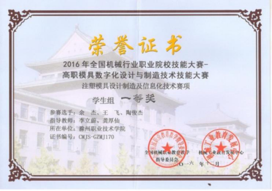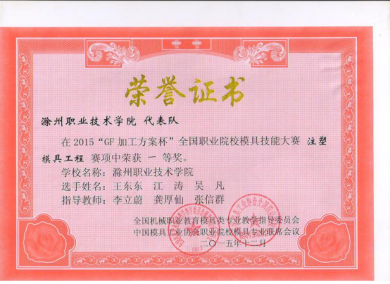 我院模具设计与制造专业于2003年12月由安徽省教育厅批准设置,2008年被确立为院级“特色专业”,并且于2011年10月被安徽省教育厅、省财政厅批准为中央财政支持高等职业学校重点建设专业项目,并获得250万元中央财政专项资金支持。2016年模具设计与制造专业为安徽省《高等职业教育创新发展行动计划(2015-2018年)》骨干专业,安徽省技能型高水平大学重点建设专业。现为全国模具工业协会人才培养基地。
