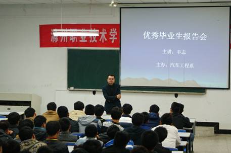 报告会上,合肥富银投资有限公司总经理丰志(原汽车工程系2010届模具设计与制造专业毕业生)首先结合自身大学经历,工作后的奋斗经历,强调梦想、目标和努力对于成功成才的重要性。接着,他联系工作中的亲身体验并引用经典案例,启发同学们要注重团队合作与自制自强能力的培养。