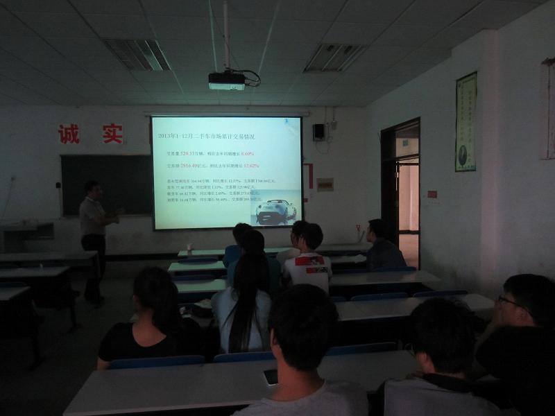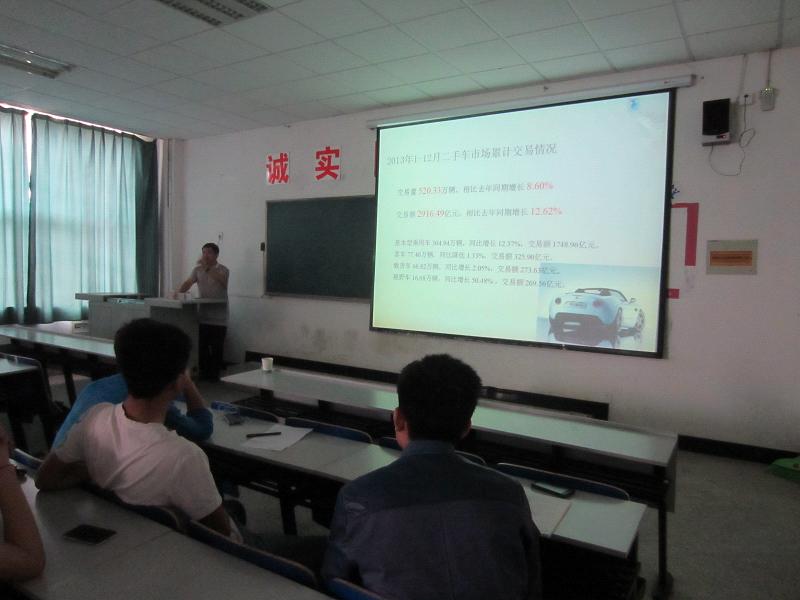 2014年5月14日下午,南京001教育科技有限公司负责人刘经理应邀来我系开展了一场“二手车就业创业” 讲座。刘经理就我国二手车市场发展前景、二手车评估师就业需求、二手车评估师需要掌握哪些技能、如何进行二手车评估师技能鉴定等作了详细介绍。
