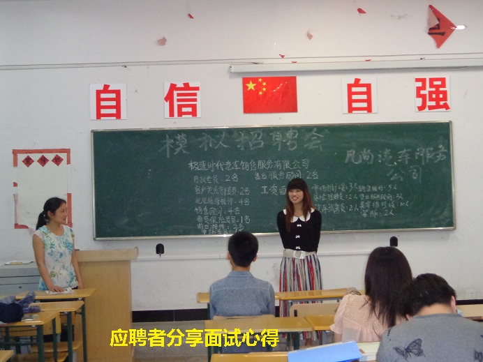 招聘会上,由班委组成的两家招聘公司分别是“极速时代汽车销售有限公司”与“风尚汽车服务公司”。首先,两家公司宣讲人依次上台为大家介绍本公司的基本概况、相应岗位需求,鼓动大家踊跃选择他们公司。随后,同学们带上自己制作的简历,结合现场对公司的了解选择适合自己的公司去应聘岗位,依次轮流面试。在面试过程中大家珍惜机会,认真咨询自己想要了解的信息,积极慎重回答面试问题,力求展现自己最好的一面。两家公司负责人详细记录应聘人员信息,并给每位应聘人员进行现场打分。在所有人员应聘完毕后,两家公司宣讲人立即公布了结果,对面试过程中的细节问题做了相应的总结。冯老师在活动的最后邀请面试的学生上台说感想,与大家一同分享这次招聘会的意义。