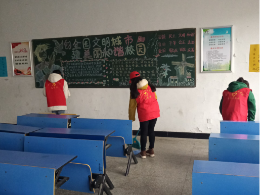 进行了简单的任务分配后,志愿者们开始行动起来。细心的他们连玻璃背面,讲台角这种容易忽略的地方都打扫的干干净净。志愿者们充分发扬了不怕累不怕脏的精神。用自己的实际行动为校园增添了一份清新,一抹光亮。