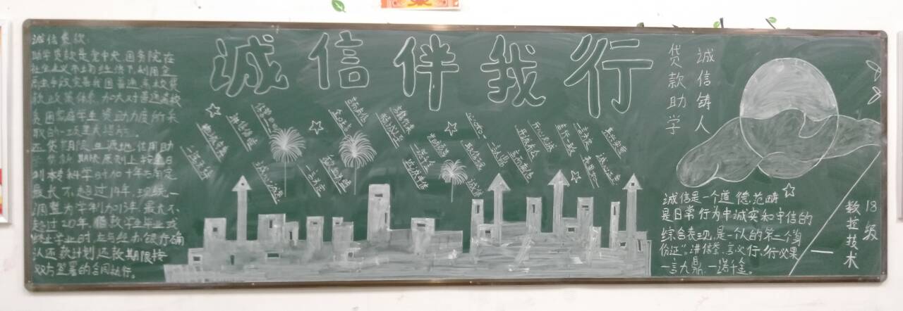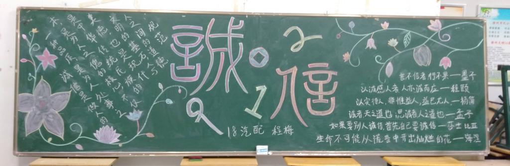 黑板报活动得到全系各班级的积极响应,同学们在班干的带领下,精心设计、竭力创作富有特色黑板报。所出黑板报不仅美观大方、创意新颖,而且色彩协调、图文及装饰布局合理,主题鲜明,充分表达了同学们对诚信二字的看重。