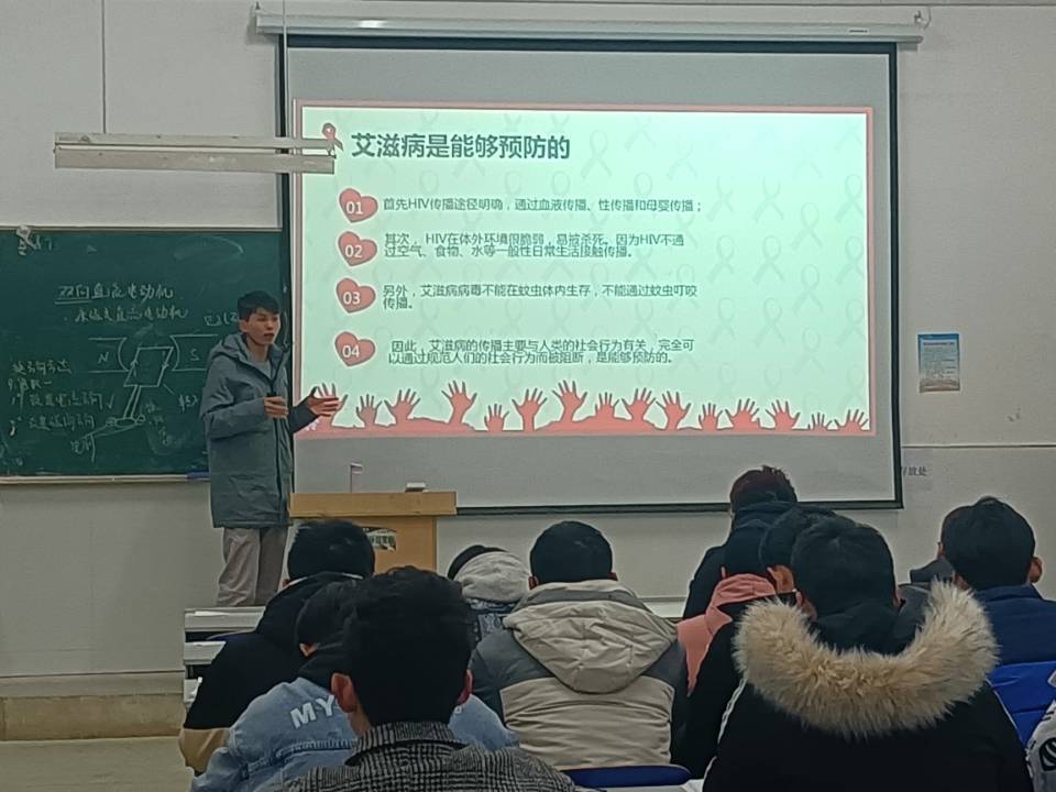 活动中,杨全从什么是艾滋病,艾滋病的危害,艾滋病毒的传染途径及艾滋病的预防四个方面来向同学们讲述。在向同学们讲述艾滋病的同时,也和同学们交流在面对艾滋病患者时应注意倾听,交流的方法,尊重和理解他人。也让同学们提高抵御来自社会的各种诱惑,自尊自爱,理性沉着面对来自外界的各种诱惑。