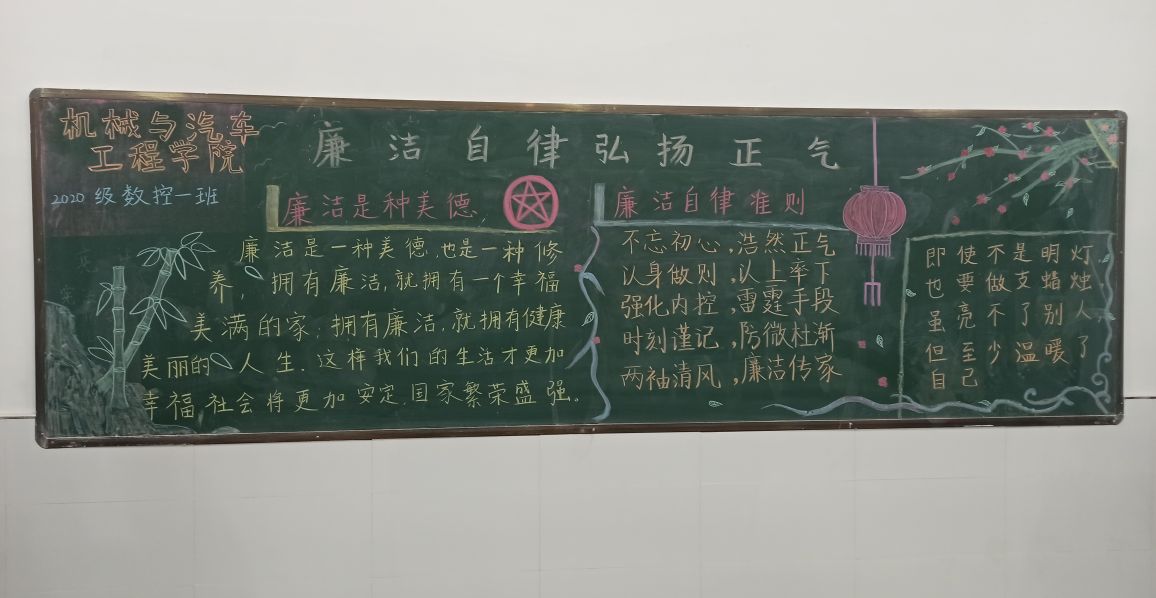 为使广大师生接受廉洁文化的熏陶,培养青年大学生敬廉崇洁的价值观念,提升学生思想道德建设水平,机械与汽车工程学院学院团总支于2020年12月7日开展“廉洁”主题黑板报评比活动。
